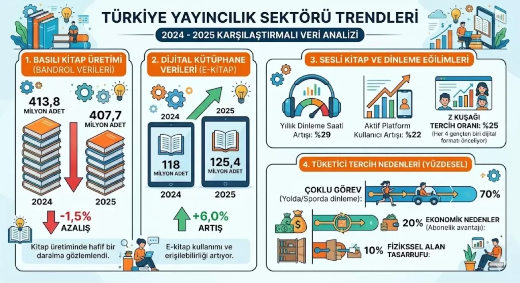 Basılı kitap azalırken dijital kütüphanelere erişim hızlandı. E-kitap sayısı %6 artışla 125,4 milyona ulaştı. En büyük patlama ise sesli kitaplarda yaşandı; dinleme süreleri bir yılda %29 artış gösterdi.