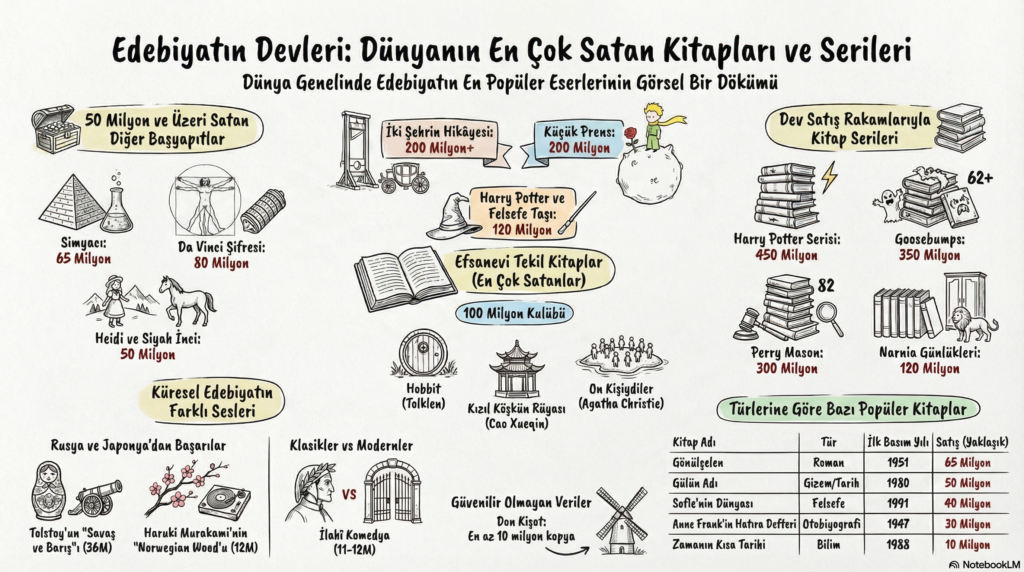 Kitap dünyasında dengeleri belirleyen ve milyonlarca okura ulaşan eserler, kapsamlı bir veri derlemesiyle yeniden gündeme geldi. Farklı dönemlere ve türlere ait yüzlerce kitabın satış rakamlarını içeren liste, hem klasik eserlerin hem de modern yapımların küresel ölçekteki etkisini gözler önüne seriyor.
