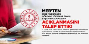 Eğitim-İş, 7 Şubat 2026’da yapılan şube müdürlüğü görevde yükselme yazılı sınavı için genel başarı sıralamasının açıklanması talebiyle MEB’e başvurdu. Eğitim-İş, 7 Şubat 2026 tarihinde gerçekleştirilen Şube Müdürlüğü Görevde Yükselme Yazılı Sınavı’na ilişkin genel başarı sıralamasının açıklanması talebiyle Milli Eğitim Bakanlığı’na resmi başvuruda bulundu. Sendika tarafından yapılan açıklamada, Milli Eğitim Bakanlığı Taşra Teşkilatı bünyesindeki 450 şube … Şube müdürlüğü sınavında başarı sıralaması açıklansın isteği okumayı sürdür